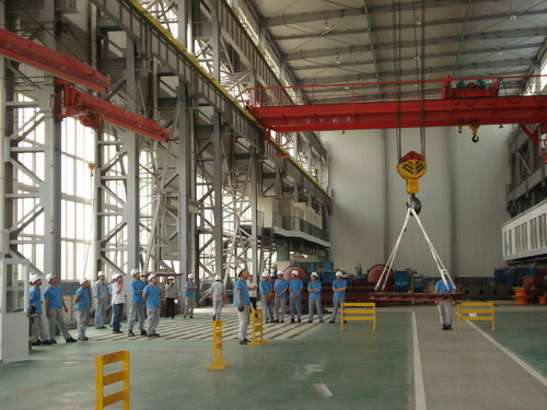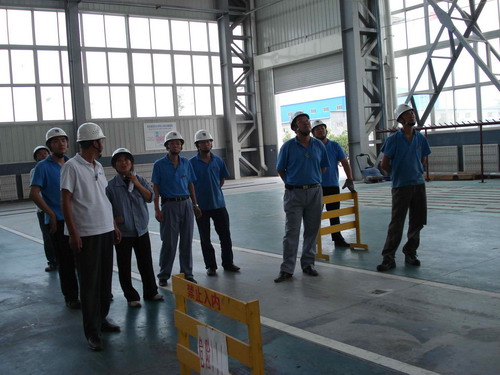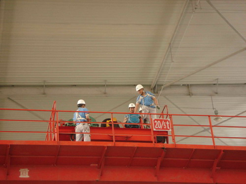 此次預演活動的主要內容是,吊車在運行過程中突然停電后工作人員的應變能力。演習開始了,首先,停電后吊車工先把開關手柄放置到“零位”并監控總電源。同時,生產部裝配班、物流班部分員工在各自科長的帶領下在吊運物件下設護欄并監護,以防有人誤進危險區域。其次,生產技術部維修人員按照安全操作規程,爬上吊車走臺,盤車移動到合適位置然后慢慢拉、合抱閘把物件送回地面。最后,解除危險。