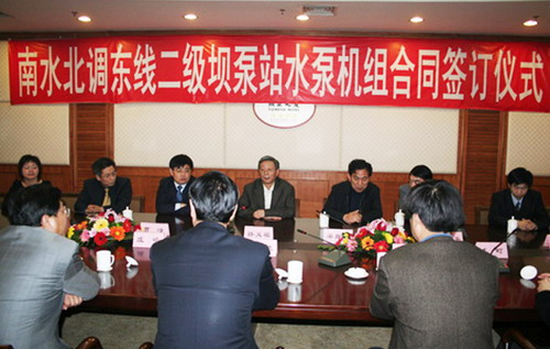 新聞中心 3月12日,南水北調東線一期工程二級壩泵站簽字儀式在山東省濟南頤正大廈隆重舉行;山東省水利廳領導、淄博市領導及荏原博泵李正民副總帶隊參加了簽字儀式。荏原博泵在南水北調主線泵站中標,標志著我公司大型泵的制造將有新的突破。