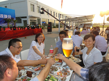 24日下午,公司辦公樓前,擺放著一排排桌椅,員工們從餐廳端著盛滿豐盛食物的餐盤,擺放在餐桌上。南面的舞臺上,工作人員在緊張的調試音響,兩只紅色的氫氣球飄揚在空中,在蔚藍的天空映襯下,格外的鮮艷,為整個會場增添了喜慶的氣氛。